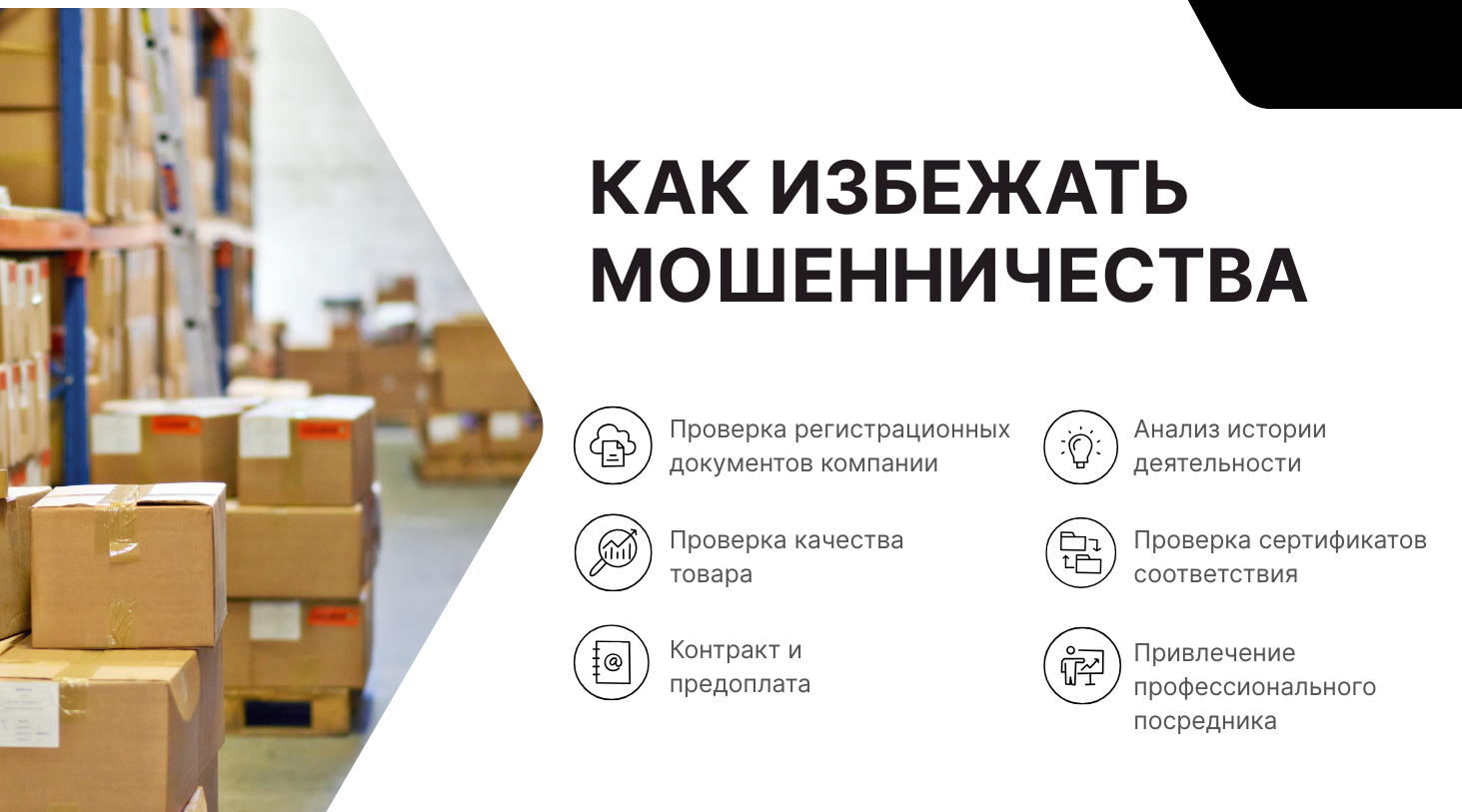 Не делайте 100% предоплаты, если вы не работали с поставщиком ранее. Лучше пользоваться гарантийными сервисами банков или поддержкой логистического партнера.